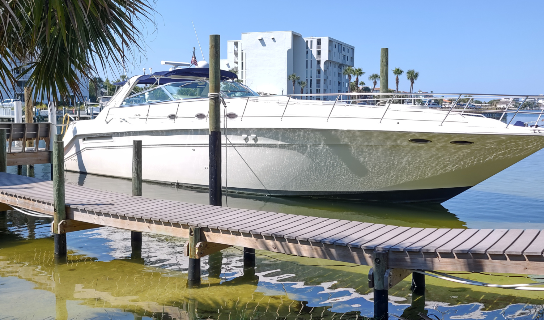 The SlapHappy yacht is perfect for a day of fun in the Destin Harbor. Our boat features a spacious U-shaped cockpit, perfect for swimming or just enjoying the water. The outdoor seating area features a large, central table area that is perfect for entertaining your guests. The table is also removable, converting this area into a sun-pad. For relaxing, the salon has wrap around seating and flows into a full galley. The master stateroom features a queen sized bed, and the guest stateroom (VIP) features two bunk beds with plenty of storage space. There are two bathrooms on the 50 foot SeaRay Yacht. We know you’ll enjoy your time aboard our yacht!