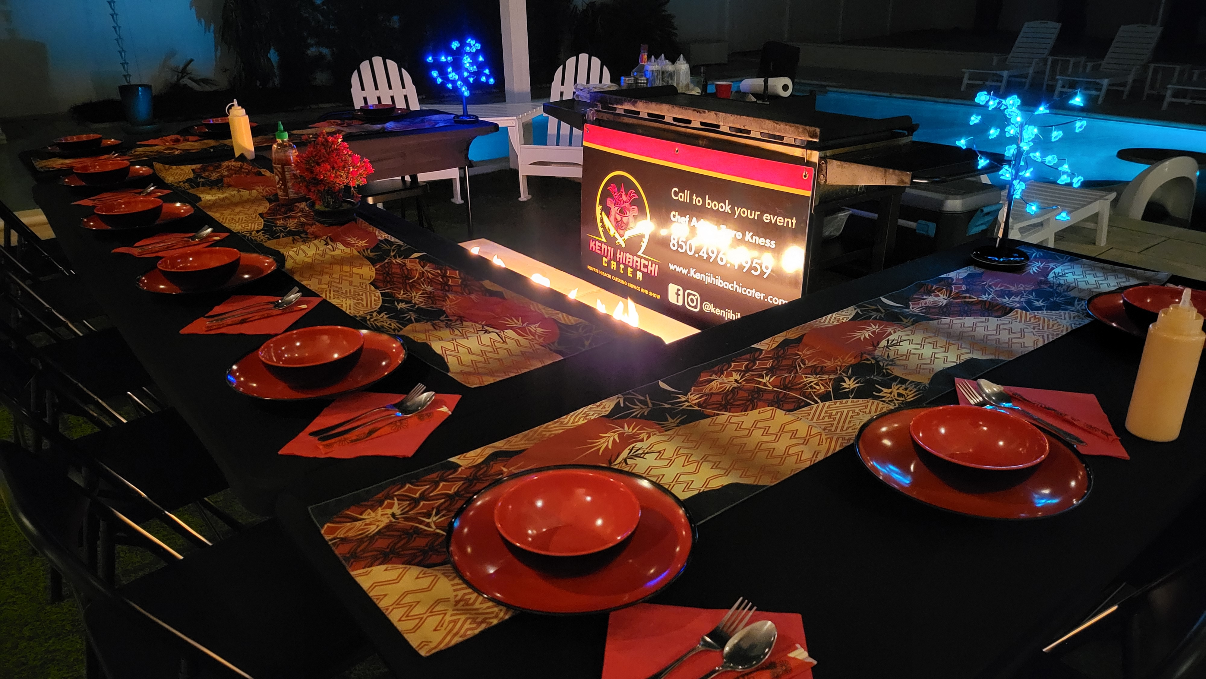 We bring everything with our full catering service. Tables, chairs, plates, bowls, utensils, chopsticks, grill, chef, waitress