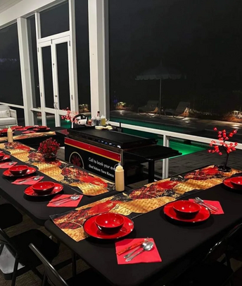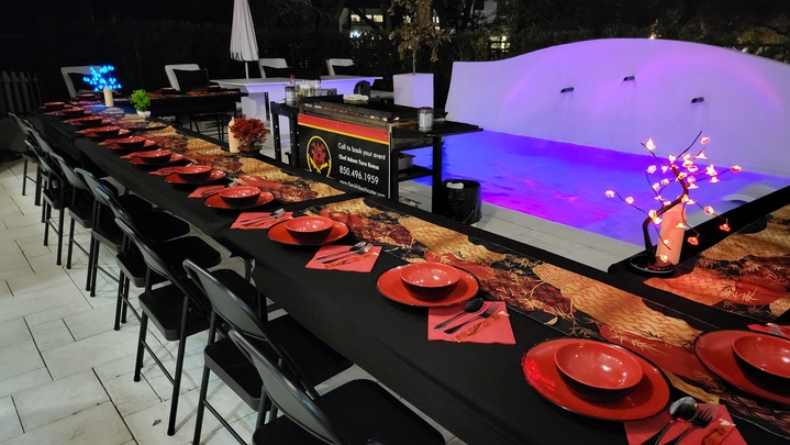 Tablecloths, decorations to go boxes. You only provide drinks. 24 years as a professional hibachi chef and will come to you! No 2 hour wait and sitting with awkward people at your typical hibachi restaurant. We use black angus beef and the best ingredients possible.