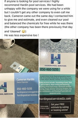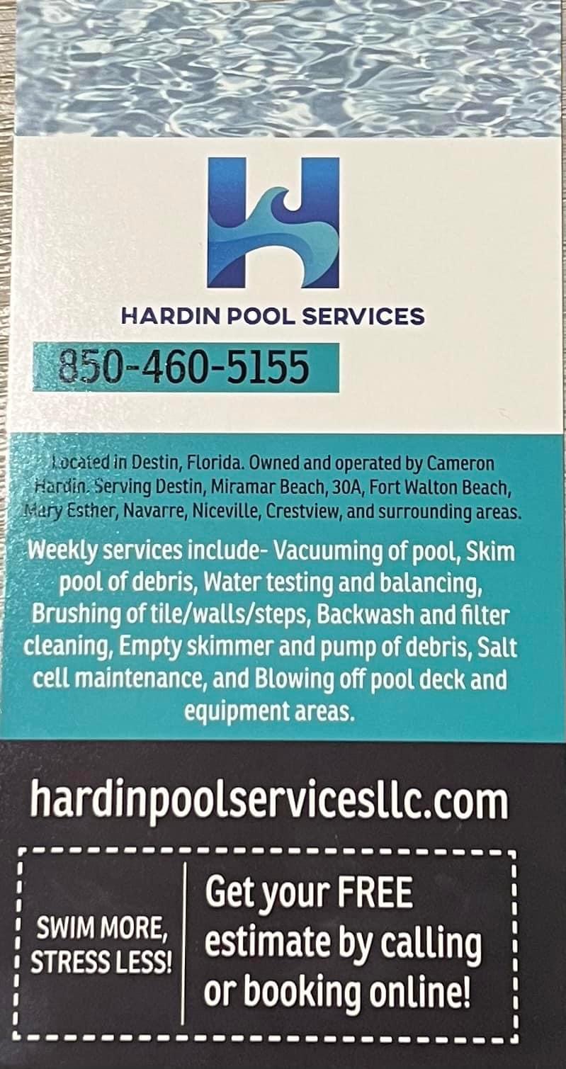 Hello, Emerald Coast! My name is Cameron Hardin, owner/operator of Hardin Pool Services, LLC. After living my dream on the water for 4 years as owner/boat captain of Cuttin' Up Fishing located on the world famous Destin Harborwalk, I decided to my talents back to dry land. But as you can see, I'm still on and in the water. I have a passion to provide best in class service for all your pool and spa needs. I'm already looking forward to meeting you!